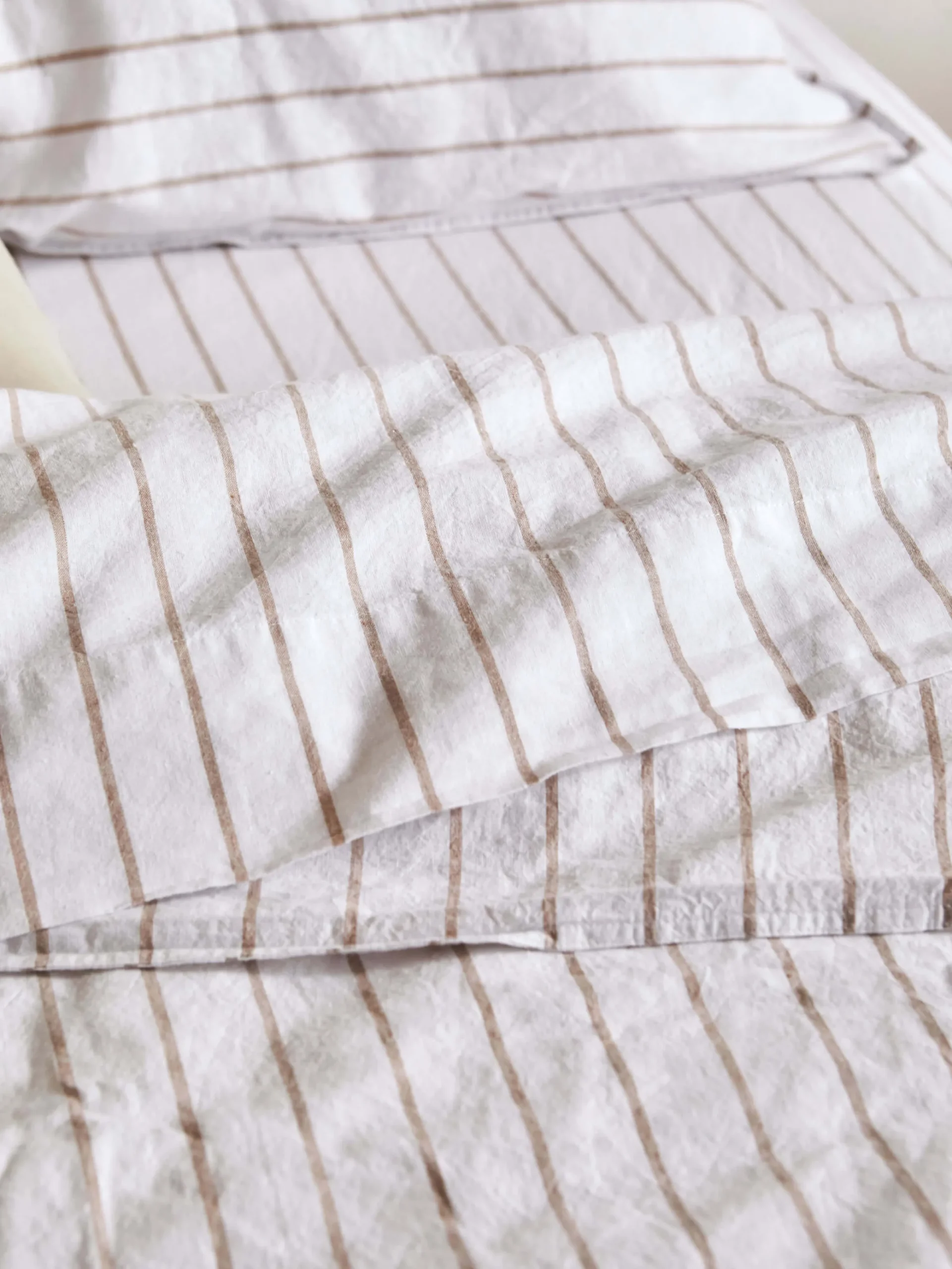 Loft features a spaced stripe woven in versatile Tan that runs across a soft off-white linen/cotton blend. Finished with a button closure, each Duvet Cover is crafted from 55% French linen and 45% cotton, pre-washed for softness.