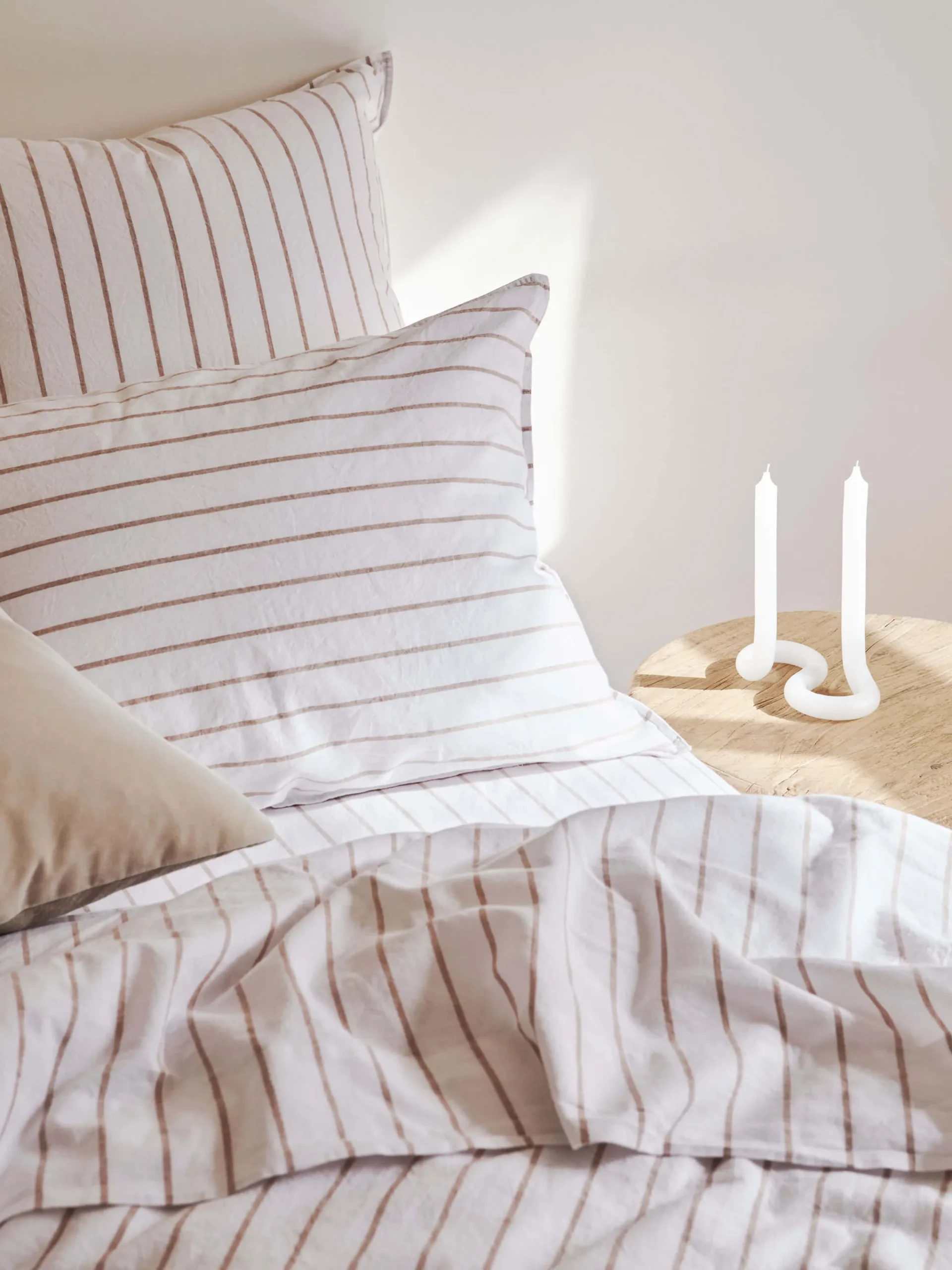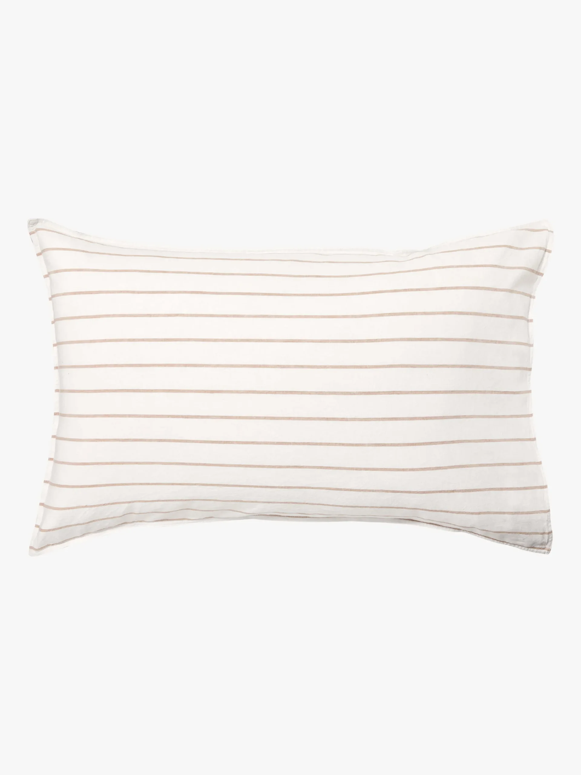 Loft features a spaced stripe woven in versatile Tan that runs across a soft off-white linen/cotton blend. Each pillowcase is crafted from 55% French linen and 45% cotton, pre-washed for softness.
