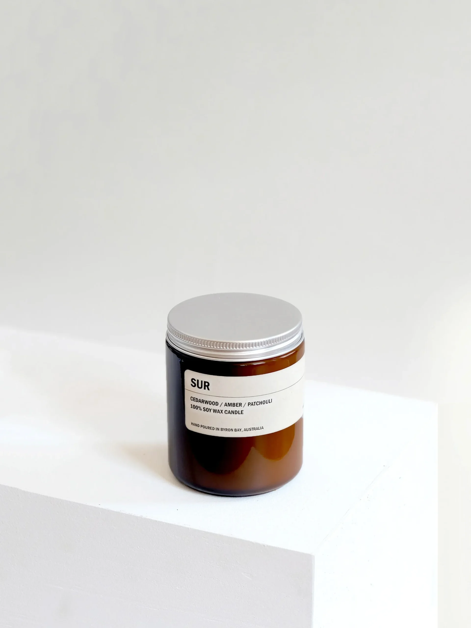 Natural 100% soy wax candle set in an amber glass jar, topped with an aluminium screw top lid.